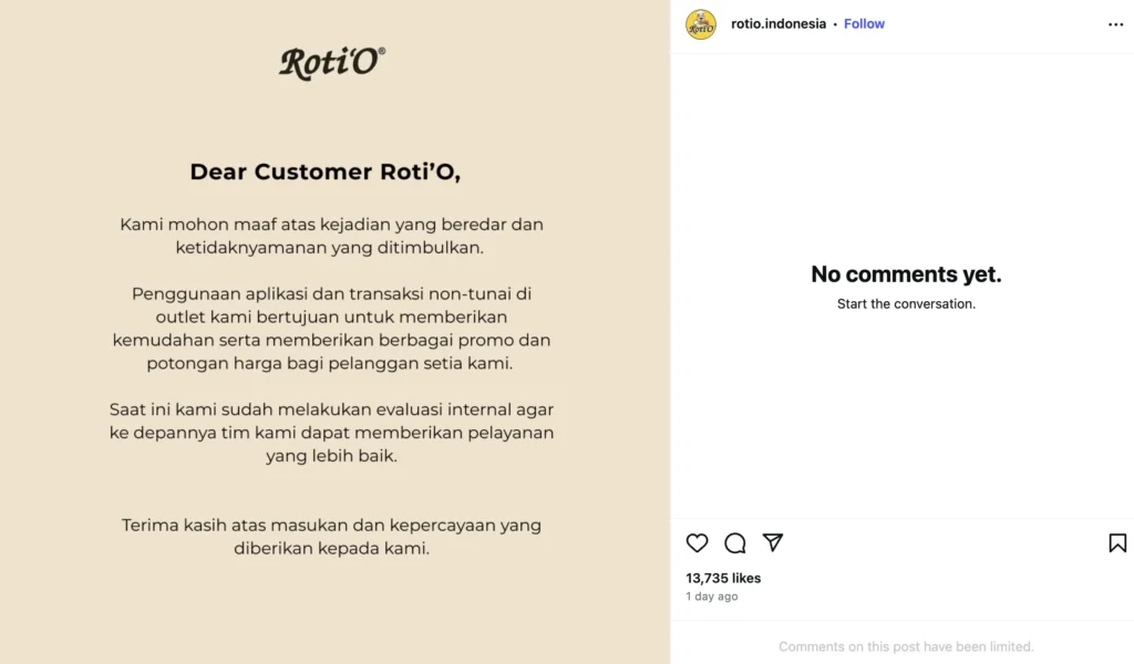 Tangkapan gambar Permohonan maaaf managemen Roti O. (Sumber: Instagram @rotio.indonesia)